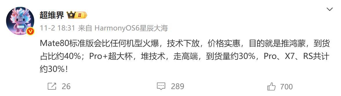 华为mate80标准版补齐了配置方面的短板,对比其他版本售价更低,热度和销量自然会更高。今年上半年的华为Pura80系列为了普及鸿蒙,标准版定价直接降价了800,所以我们不排除mate80标准版对比上一代mate70系列也有所降价,mate系列整体的竞争力更强,所以降价幅度没有那么大,但降价500还有可能的,就是说mate80标准版有望4999起。