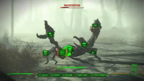 在《辐射4》中,有一个叫做“VATS”的战斗系统,你可以把他理解成是一种类似子弹时间的机制,可以减慢游戏时间并且允许玩家自由选择射击头部、躯干、四肢或是其他地方,是否命中则取决于概率。