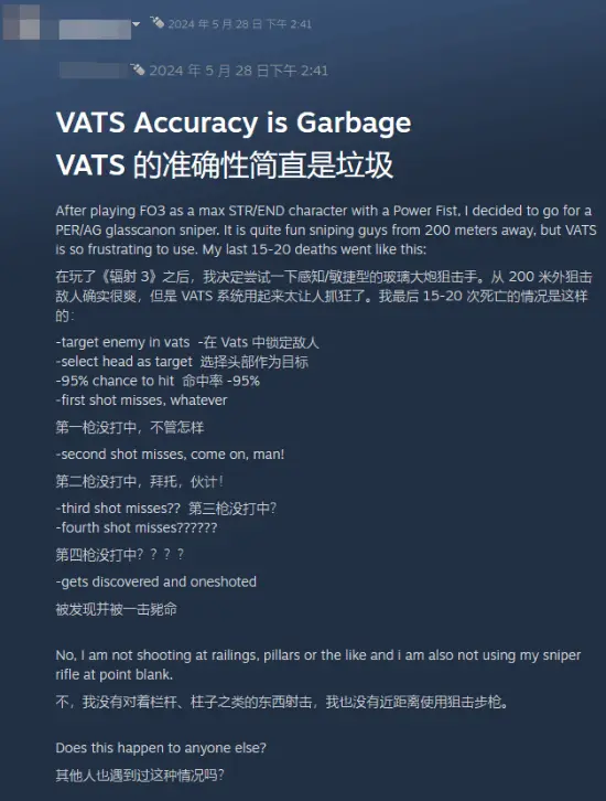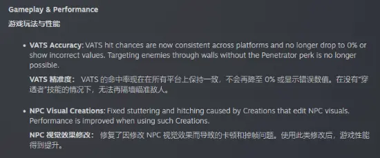 然而在昨天的更新补丁中,Bethesda终于承认,这并非玩家的错觉,也不是刻意设计的机制,而是的的确确在程序层面存在的bug。公告中写着“VATS的命中率现在在所有平台上保持一致,不会再降至0%或显示错误数值”。