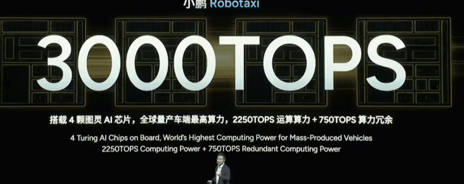 小鹏Robotaxi并非“实验室概念车”,而是面向L4级自动驾驶标准打造的可量产车型。车身搭载了4颗图灵AI芯片,总算力高达3000 TOPS——这是目前全球量产车端最高的算力水平。
