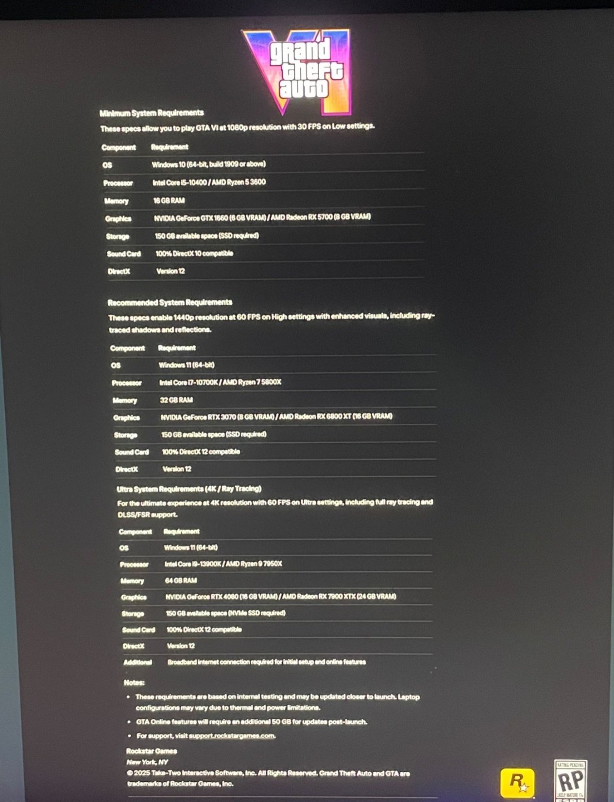 难道首发PC?网传图片显示《GTA6》PC配置需求亲民!