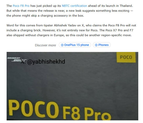 【CNMO科技消息】11月7日,CNMO了解到,据海外媒体gizmochina报道,小米海外子品牌POCO旗下的一款全新机型——POCO F8 Pro可能取消赠送充电器。