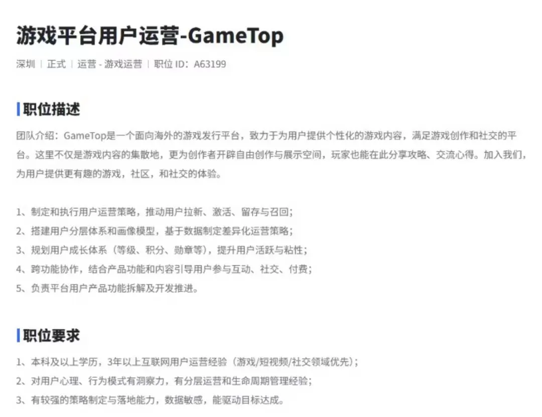 字节为GameTop招聘信息显示,用户运营的工作职责需要规划用户的成长体系,包括等级、积分、勋章等,同时结合产品功能引导用户参与互动和付费。这些不难看出,目前GameTop还处于雏形阶段,远没有运营多年的Steam成熟。