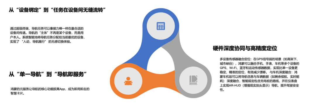 就拿旅行来说,鸿蒙可以融合手机、手表、车机等多个设备的 GPS、Wi-Fi、蓝牙和运动传感器数据,实现比单一设备更稳定、精准的定位,这都是开发者可以发力的支点,帮用户解决在GPS信号弱的场景下的定位和导航问题。而鸿蒙车机版还可以将导航信息与车辆数据融合,智能规划包含充电桩的路线等等,让产品真正成为用户的靠谱伙伴。