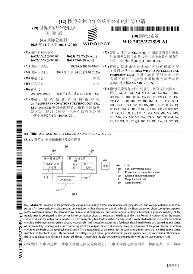 证券之星消息,根据企查查数据显示安克创新(300866)公布了一项国际专利申请,专利名为“电压输出电路及充电设备”,专利申请号为PCT/CN2025/078804,国际公布日为2025年11月6日。
