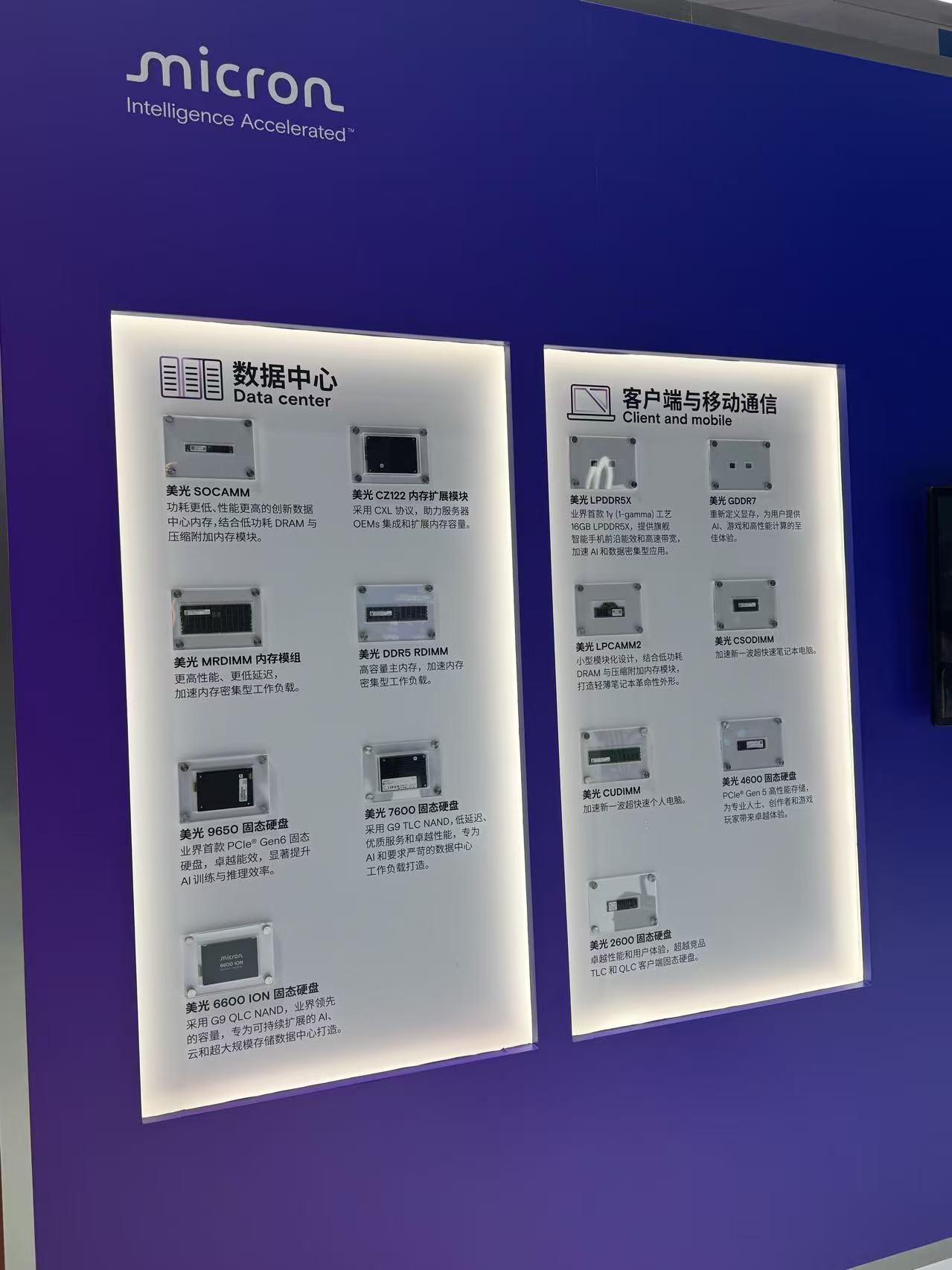 在数据中心新领域,美光展示了其MRDIMM内存模组、DDR5 RDIMM、SOCAMM、CZ122 内存扩展模块、9650 固态硬盘、6600 ION 固态硬盘、7600固态硬盘。据介绍,美光9650固态硬盘为业界首款 PCIe® Gen6 固态硬盘,AI训练与推理效率有所提升。