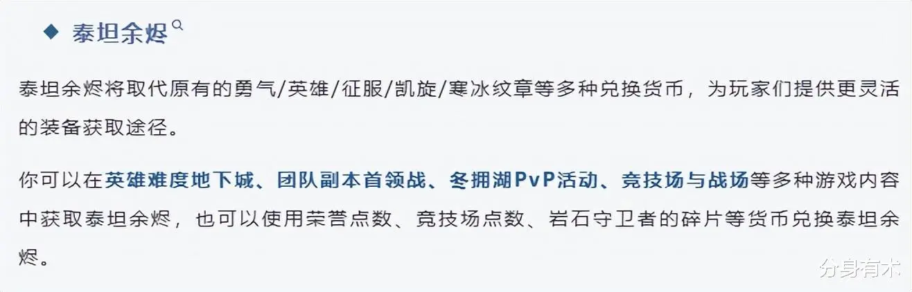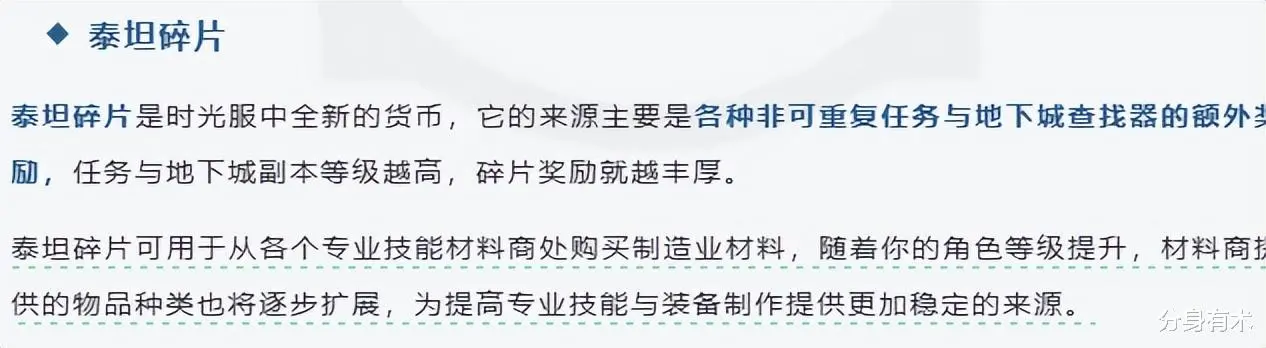 第一个新增东西泰坦碎片,各种非可重复任务,以及地下城查找器的额外奖励,而且它会随着等级的提升,兑换的材料也会更多,带来的第一个商机,以及要注意的关键信息,什么叫做非可重复任务,也就是说我们的黄色任务,非日常任务,都是可以获得泰坦碎片的,地下城查找器的额外奖励,代表着这一次是有随机副本的一个加入,其次第一个商机是什么呢,就是我们泰坦碎片,兑换什么材料会最划算,因为要知道我们的制造专业,需要的材料非常的多,都是需要一定比例的泰坦碎片去兑换的,到时候我们要拍卖行对比价钱,再去兑换这个材料,才能产出最大的收益,而且透露了如果我们去做任务升级,也会产出额外的一个收益,之前喜欢随机副本升级的玩家,或者aa队升级的玩家,这里的收益就赚不到了。