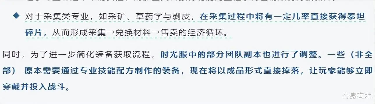 第四点专业技能的改动,这是一个非常重点的内容,我会给大家仔细讲一下,制造业的物品门槛降低采集专业的一个收益提高,主要讲的是工程的火箭靴不需要工程就可以学了,这个时候反而可能你更需要练工程了,因为我们要知道,工程的火箭靴大多数人都是需要的,我们把这个工程的火箭靴的一个附魔,附魔给别人的话,是不是也会带来一定收益呢,而且大多数人不选择工程,工程反而可能会带来收益,而且采集专业的话,会有一定几率直接获得泰坦碎片,这里的话收益就会更好了,双采和剥皮都起飞。