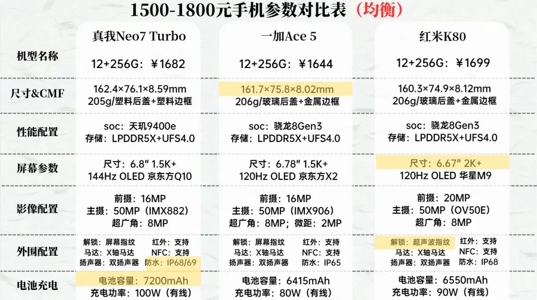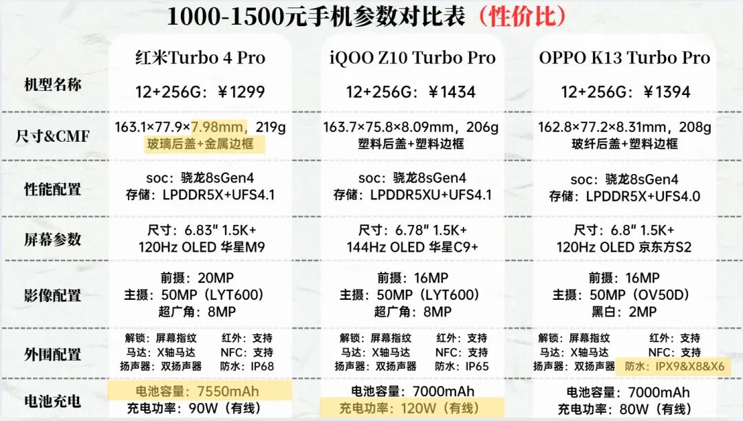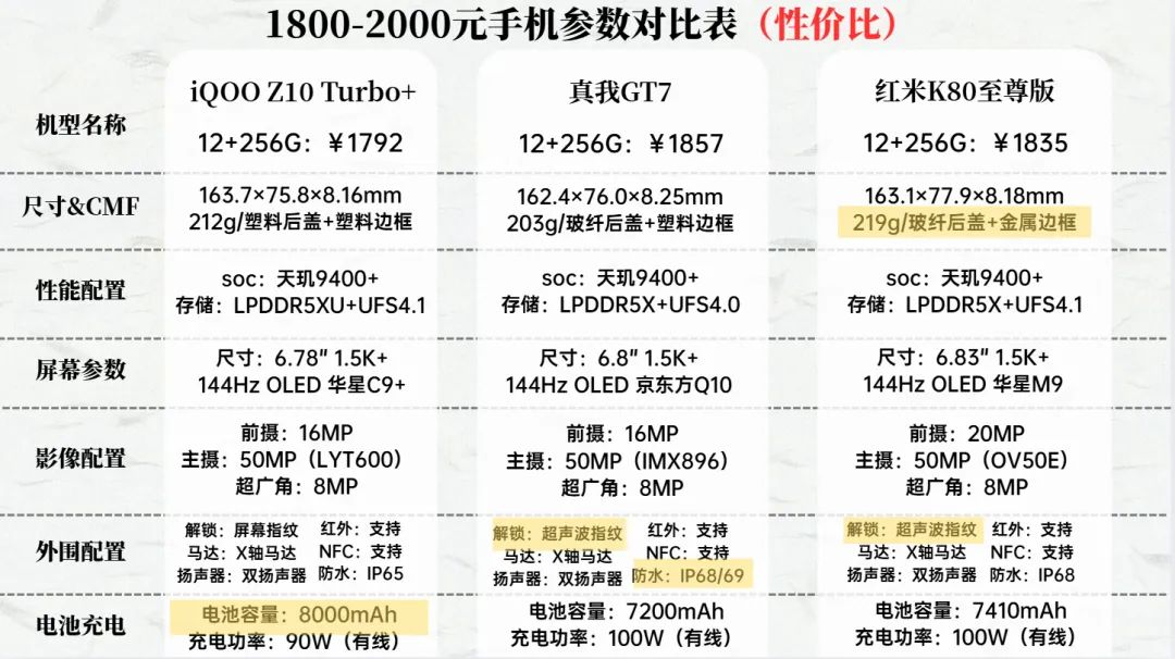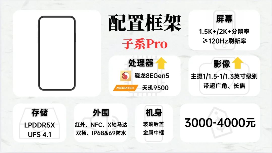 这个价位就是子系Pro机型的天下了,相比与子系标准版,子系Pro处理器性能全面升级到今年最新的骁龙8E5和天玑9500,影像上也有所升级,部分机型上了旗舰级的1/1.3英寸主摄。
