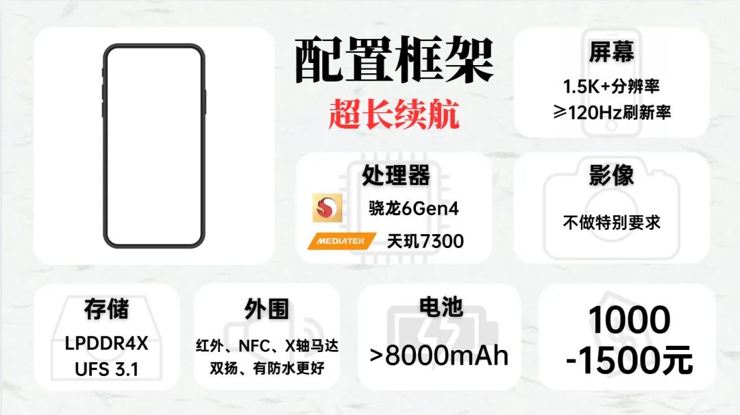 超长续航框的配置是百元机水平,但搭载了更大的电池,加上低功耗的处理器,续航表现优异。