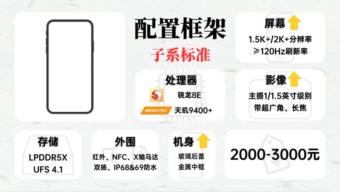 今年子系标准版机型基本都发完了,相比上一个价格档的机型,这一代子系标准在配置上几乎没有差别,在机身质感、影像上有一些小的升级,用2K屏幕的机型也更多了。
