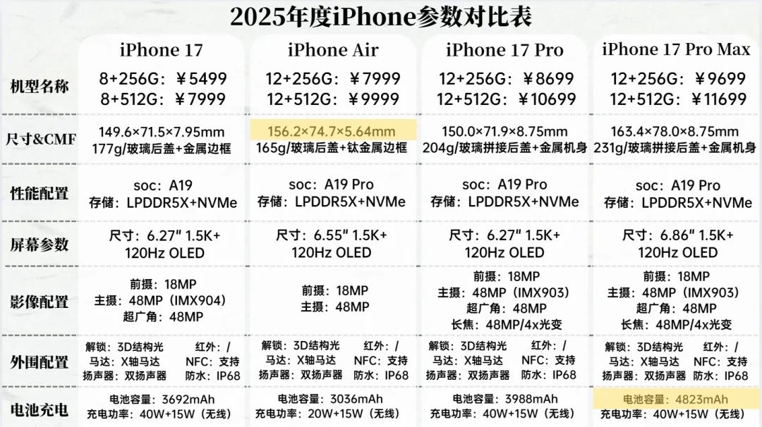最后盘点一下今年的iPhone 17系列,今年一共有4款iPhone,参数配置如下: