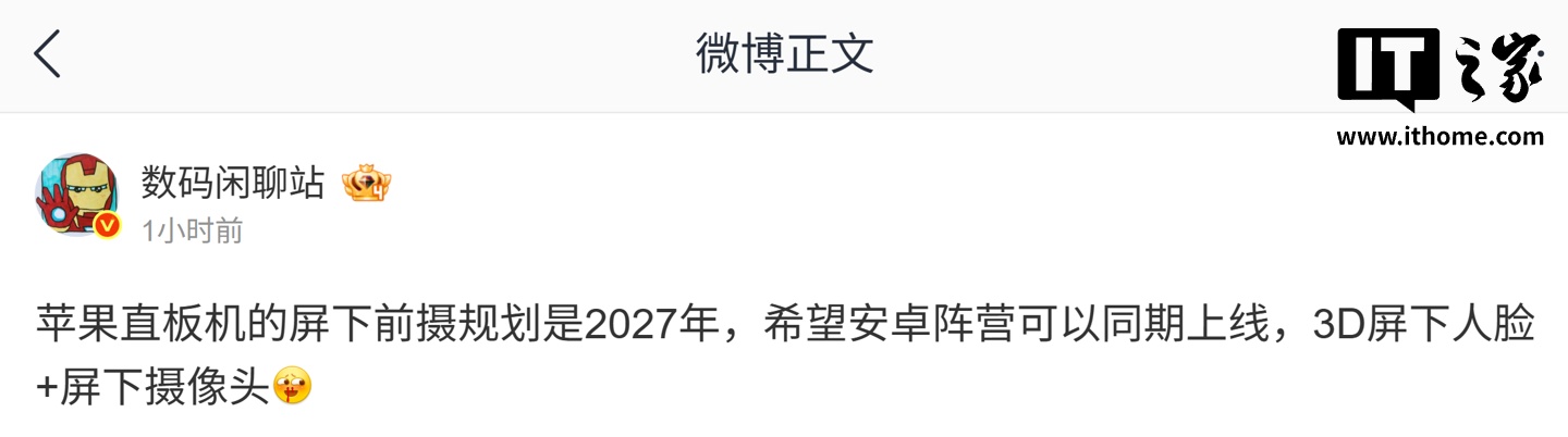 IT之家 11 月 8 日消息,博主 @数码闲聊站 今天在微博透露,苹果直板手机的屏下前置摄像头目前规划是 2027 年上线。