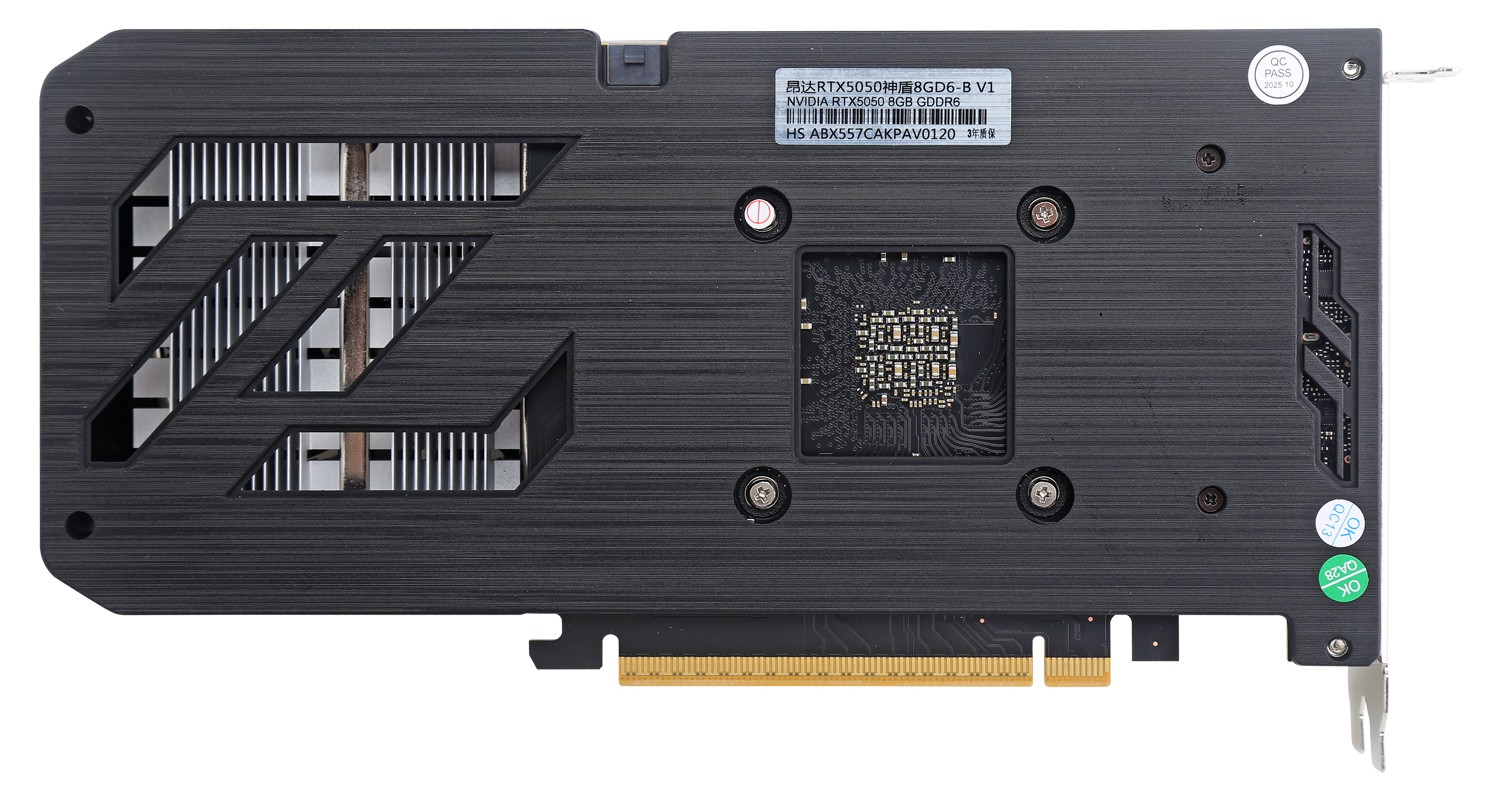 昂达 RTX 5050 神盾 8GD6 V1 三维 227×110×43 (mm),配备 2 颗支持低负载智能停转的 9mm 双滚珠轴承风扇,具有金属热管和一体成型全覆盖散热模组,还附带阳极铝金属背板。