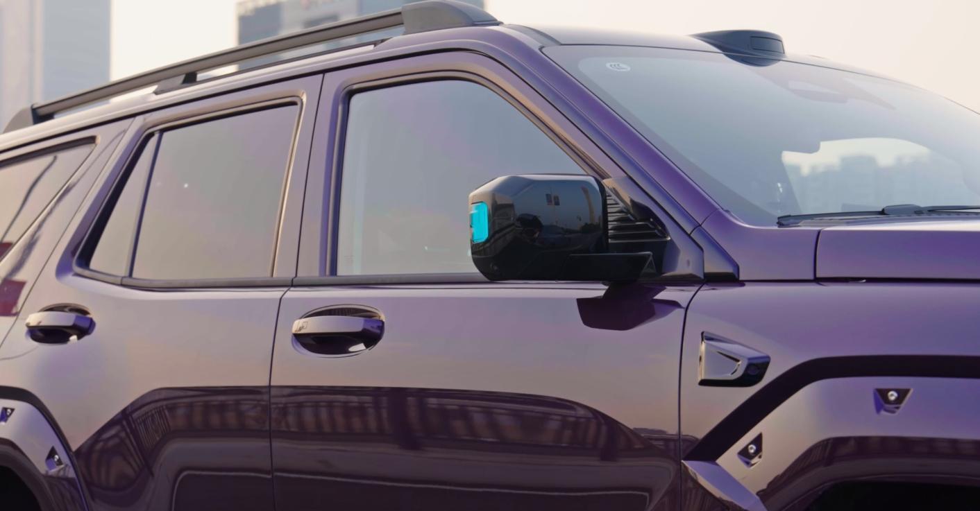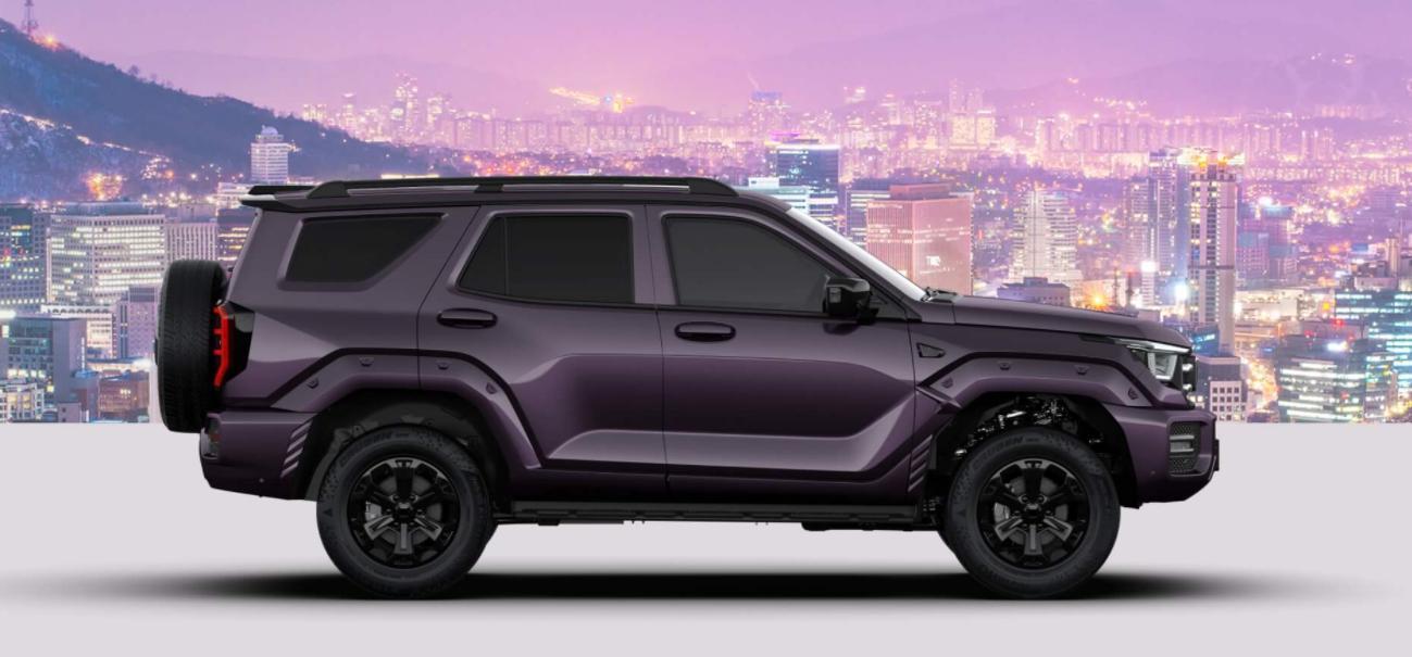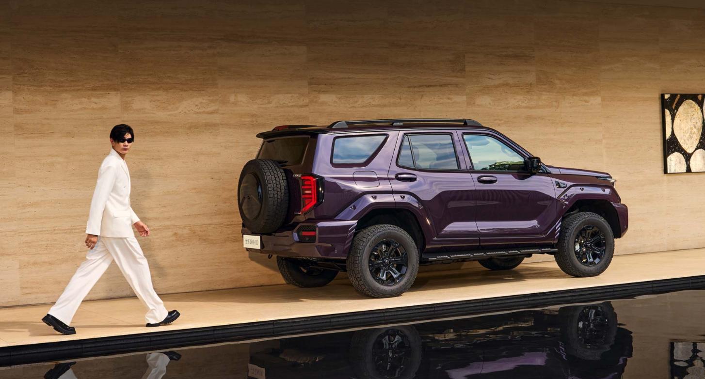 具体来看新款的变化,外观改动主要集中在前后的包围部分。前包围两侧原先向上内收的设计被取消了,取而代之的是向两侧延伸的平直造型。这个改动让车头看起来整体感更强,同时视觉上也让人觉得前格栅的尺寸变得更大了。车头依然保持着宽厚霸气的姿态,充满越野车应有的力量感,但不像现款车型那样棱角分明、咄咄逼人。它少了一些极致的硬核感,多了一份沉稳与从容。在颜色选择上,新车提供了幻夜黑、飞翼银、星云灰以及更具个性的敦煌紫。