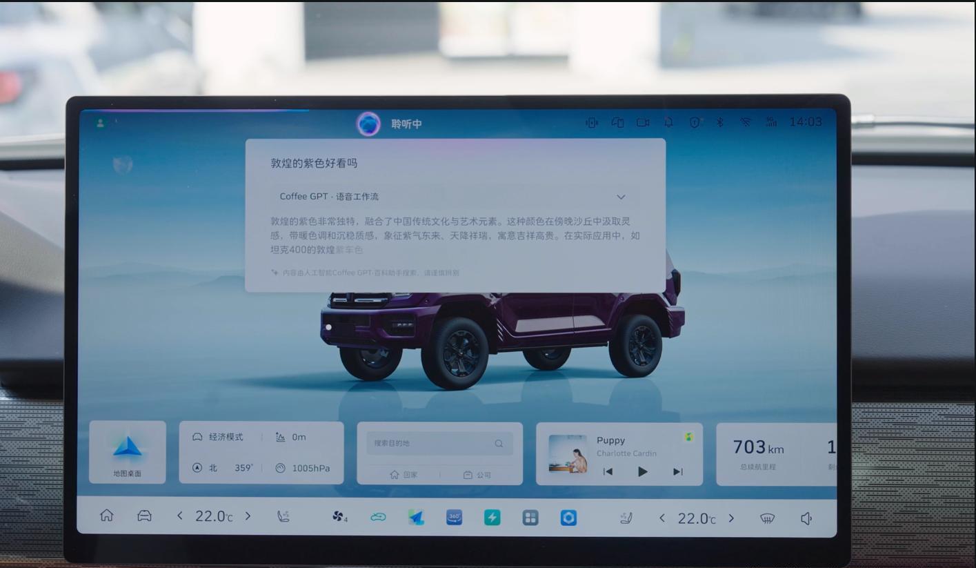 在智能座舱方面,新车搭载了长城汽车最新的第三代智慧空间系统Coffee OS 3,并且配备了高性能的8295芯片。它还引入了Coffee GPT语音大模型,这使得车机系统能够更深度地理解用户的语义和需求。即使是比较模糊的指令,它也能比较精准地识别并执行。在智能化配置上,新款坦克400已经向此前发布的、定位更高的坦克500系列车型看齐。