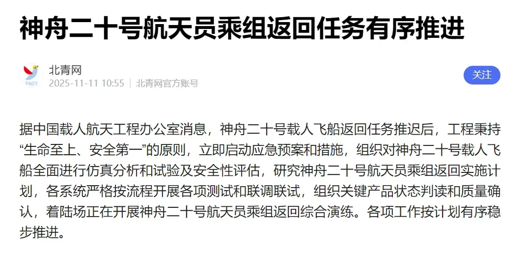 神舟二十号和神舟二十一号航天员乘组在11月4日进行了交接仪式,中国空间站的钥匙移交给了神舟二十一号航天员乘组,神舟二十号航天员乘组的全部既定任务就已经全班完成了。按照最初的计划,神舟二十号飞船在11月5日就返回地球的,不过现在这3名航天员的返航推迟了,现在还没返航。