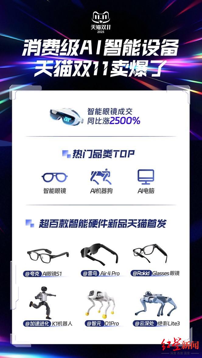 智能眼镜作为AI硬件的代表性品类,在今年双11表现尤为抢眼——天猫10月30日数据显示,开售以来智能眼镜成交额同比暴涨25倍,成为3C数码行业增长最快的品类之一。从工具到伙伴,AI正在通过智能眼镜这一载体,重新定义人机交互的边界,重构我们的消费生活方式。