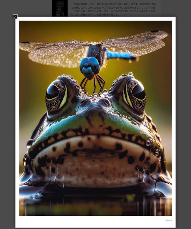 主办单位原本将一等奖颁给一张名为《这是我的头啊!》(俺の頭だぞ!)的摄影作品,画面捕捉到蜻蜓轻巧停在青蛙头上的逗趣瞬间,被评审盛赞为“兼具不可思议魅力与亲切感的佳作”