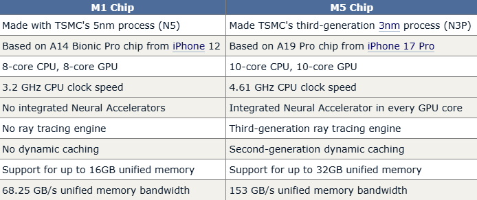 【CNMO科技消息】目前,苹果采用自研芯片Apple silicon取代英特尔芯片、全面搭载Mac产品线已达五年。在这段时间里,苹果M系列芯片的CPU与GPU性能均实现显著提升。此外,苹果还通过硬件加速光线追踪技术、持续优化的神经网络引擎等附加功能,进一步强化了设备在人工智能与游戏领域的表现。下面CNMO把现在的M5芯片与五年前的M1芯片做性能对比。