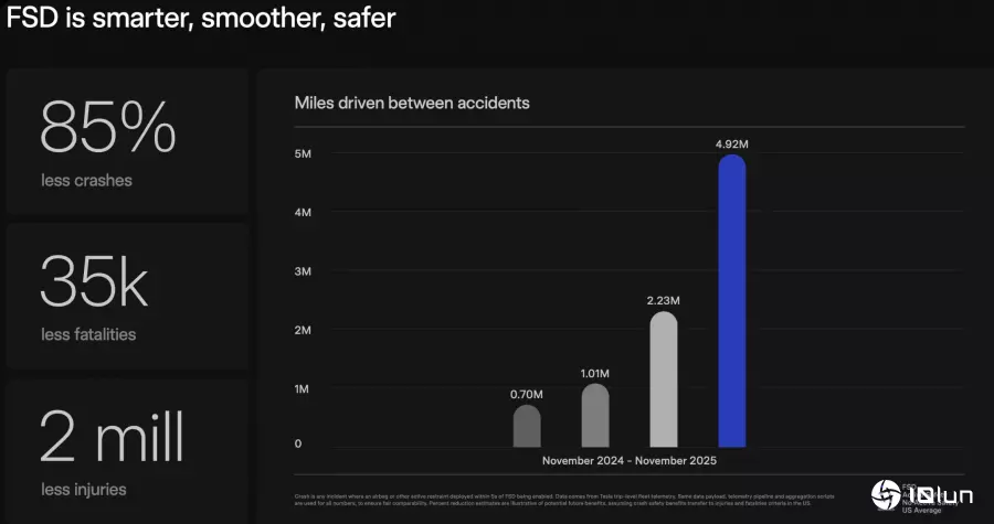 该公司会发布季度《自动驾驶安全报告》,包括在启用Autopilot功能的特斯拉车辆与未启用该功能的车辆之间的行驶里程与事故率比较,以及与美国平均事故里程的对比。