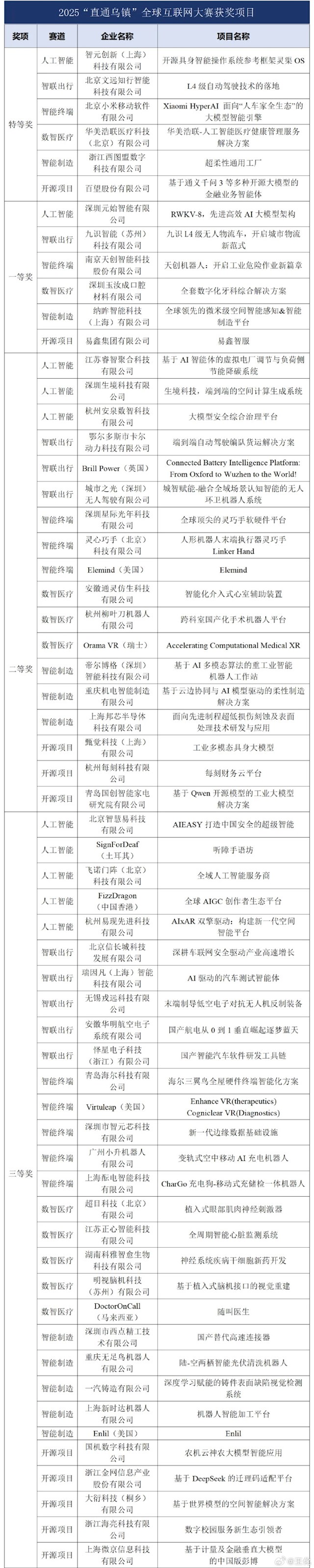 据了解,“直通乌镇”全球互联网大赛是世界互联网大会乌镇峰会标杆性赛事,由国家网信办和浙江省政府联合主办,今年共征集到来自全球29个国家的1082个项目报名,最终从入围决赛的71个项目中评选出6个特等奖、6个一等奖、18个二等奖和30个三等奖项目。
