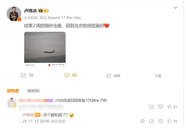 快科技11月15日消息,小米集团总裁卢伟冰结束2周的海外出差回到北京。有网友留言:“卢总应该回国准备小米17 Ultra了吧”。卢伟冰回复:这个你都知道了?