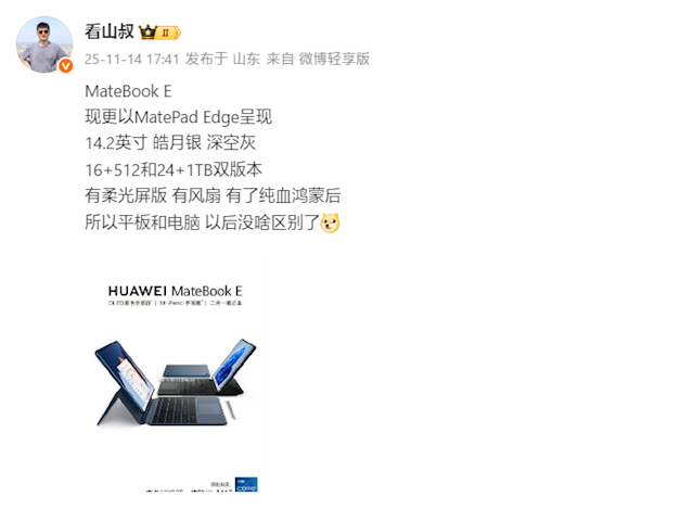 按照博主看山叔的爆料,这款新品将会命名为——华为MatePad Edge。