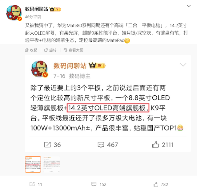快科技11月15日消息,博主数码闲聊站透露,华为Mate80系列同期还有个高端二合一平板电脑,采用14.2英寸超大OLED屏幕,还会有华为平板上常见的柔光屏版本。