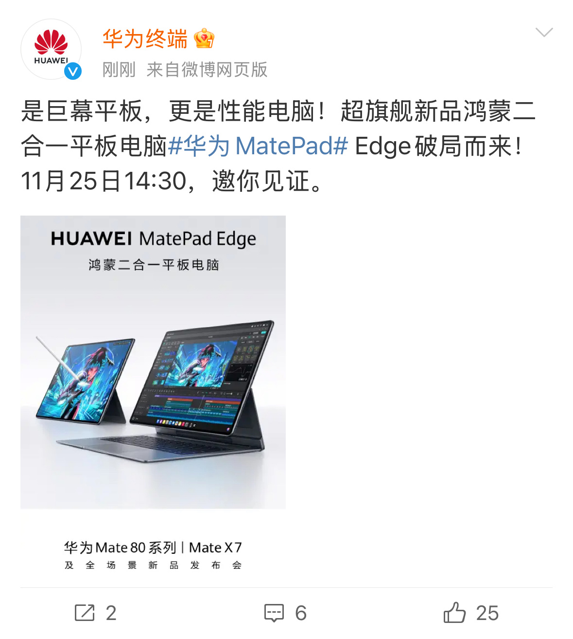 IT之家 11 月 19 日消息,华为官宣了旗下首款鸿蒙二合一平板电脑华为 MatePad Edge,引起外界的广泛关注。这款华为 MatePad Edge 鸿蒙二合一平板电脑将于 11 月 25 日华为 Mate80 系列|Mate X7 及全场景新品发布会上发布。