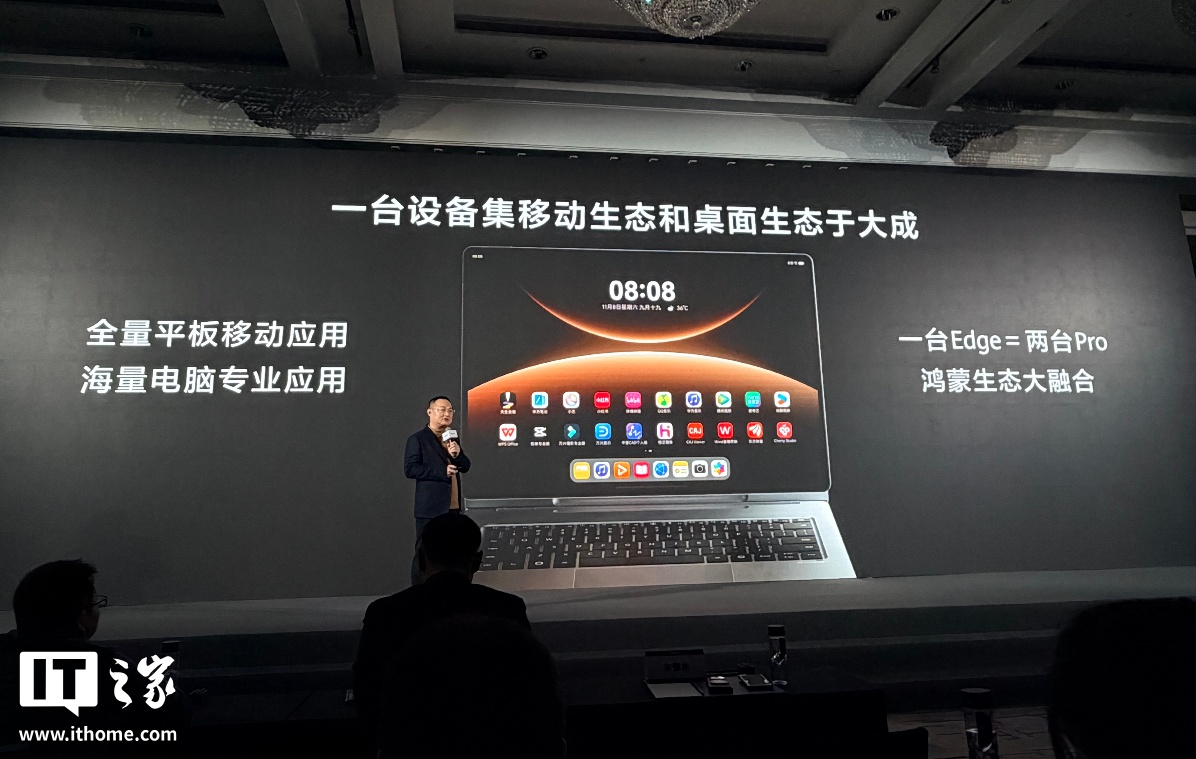 而在 11 月 19 日下午,华为又针对这款 MatePad Edge 举办了一场鸿蒙办公新品技术沟通会,IT之家也作为受邀媒体参加。在这场闭门会议上,华为 MatePad Edge 首次亮相,华为终端平板与 PC 产品线总裁朱懂东对这款产品的创新形态、双模式双生态融合、关键技术以及智能办公等方面进行了详细介绍。