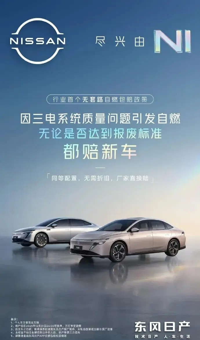 无独有偶,日产N6、N7也推出“行业内首个无套路自燃包赔政策”,公开承诺因三电系统质量问题发生自燃,均提供补偿同等配置的新车,并且不计算折旧。