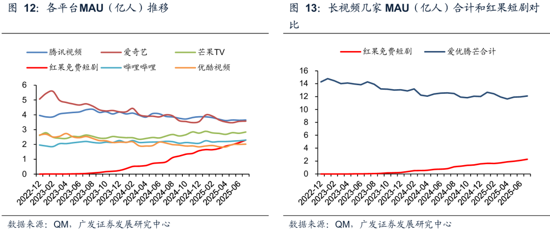 从用户数据来看,除了主打综艺的芒果之外,其他长视频平台均在下滑。广发证券研报显示,从月活跃用户来看,25年7月,爱优腾芒四家长视频平台MAU合计为12.10亿,同比下滑4%;红果短剧达到2.3亿,同比增长179%。