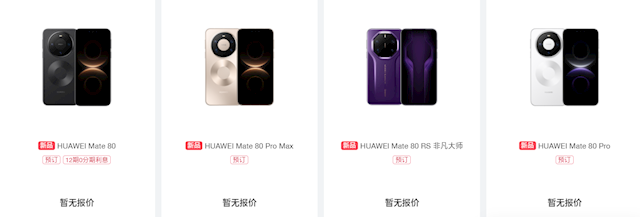 目前,Mate 80系列四款新机均已上架官网,分别是Mate 80、Mate 80 Pro、Mate 80 Pro Max和Mate 80 RS。