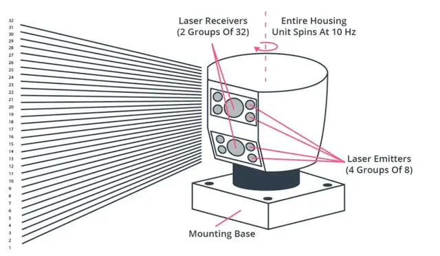 比如最早的机械式激光雷达,也就是转圈圈的那种,就可能会同时发射出 32 条激光线束探测环境,那这就是一个 32 线的激光雷达。