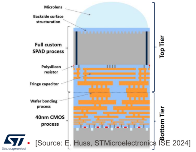 巧的是,这种方案的核心: SPAD-SoC 芯片的构造也几乎和相机上的 CMOS 一模一样,都需要用 3D 堆叠的方式制造。