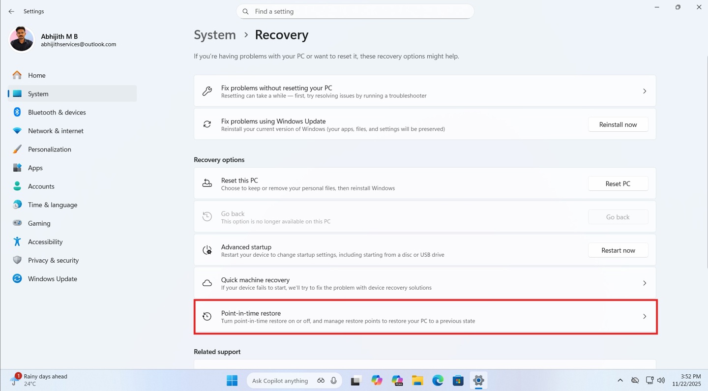 IT之家 11 月 24 日消息,科技媒体 Windows Latest 昨日(11 月 23 日)发布博文,报道称在 Windows 11 预览版中,微软引入名为“时间点还原”(Point-in-time restore)的重量级系统恢复功能。