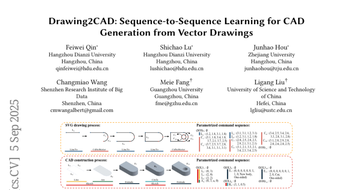 这项突破性研究以"Drawing2CAD: Sequence-to-Sequence Learning for CAD Generation from Vector Drawings"为题,发表于2025年10月在都柏林举办的第33届ACM国际多媒体会议(ACM MM 2025)上。研究团队包括杭州电子科技大学的秦飞伟和路世超、浙江大学的侯俊豪、深圳大数据研究院的王昌苗、广州大学的方美娥,以及中国科学技术大学的刘利刚。有兴趣深入了解这项研究的读者可以通过DOI链接https://doi.org/10.1145/3746027.3755782或者访问GitHub仓库https://github.com/lllssc/Drawing2CAD获取完整论文和数据集。