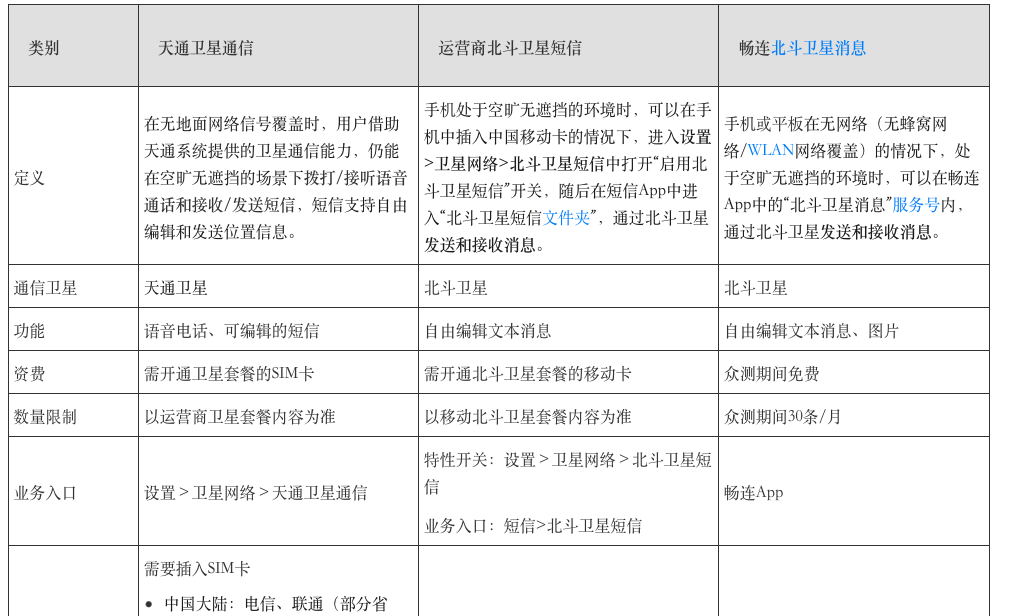 此外,华为官网还提供了《运营商北斗卫星短信、畅连北斗卫星消息与天通卫星通信规格对比》,对各类功能的使用条件和限制有更为详细的说明。