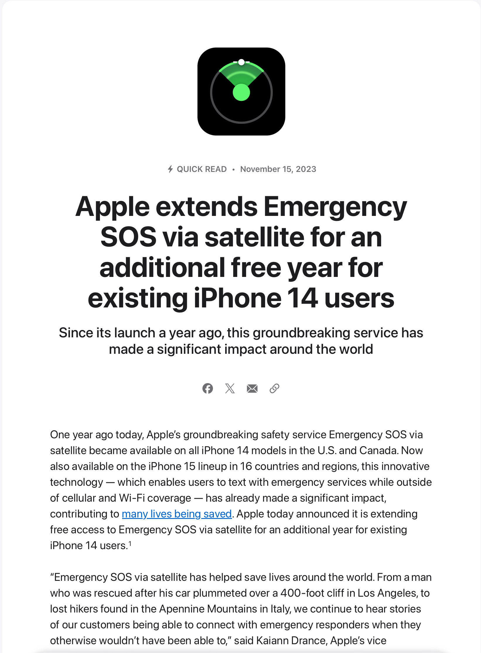在我看来「卫星通讯」最早的起点是 Apple 在 2022 年为 iPhone 14 引入了 Emergency SOS via Satellite(紧急卫星 SOS)1,使用户即便身处于没有蜂窝网络和 Wi-Fi 的偏远地区,依然能够通过卫星向紧急服务中心发送求助信息。
