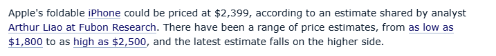 【CNMO科技消息】据外媒消息,富邦投顾分析师廖嘉庆发布的最新研报显示,苹果的首款折叠屏iPhone Fold预计售价将高达2399美元(约合人民币1.7万元),处于此前市场预测区间(1800–2500美元)的高端水平。这一价格主要源于其采用的高成本核心组件,包括定制化内折OLED面板与精密液态金属铰链系统。