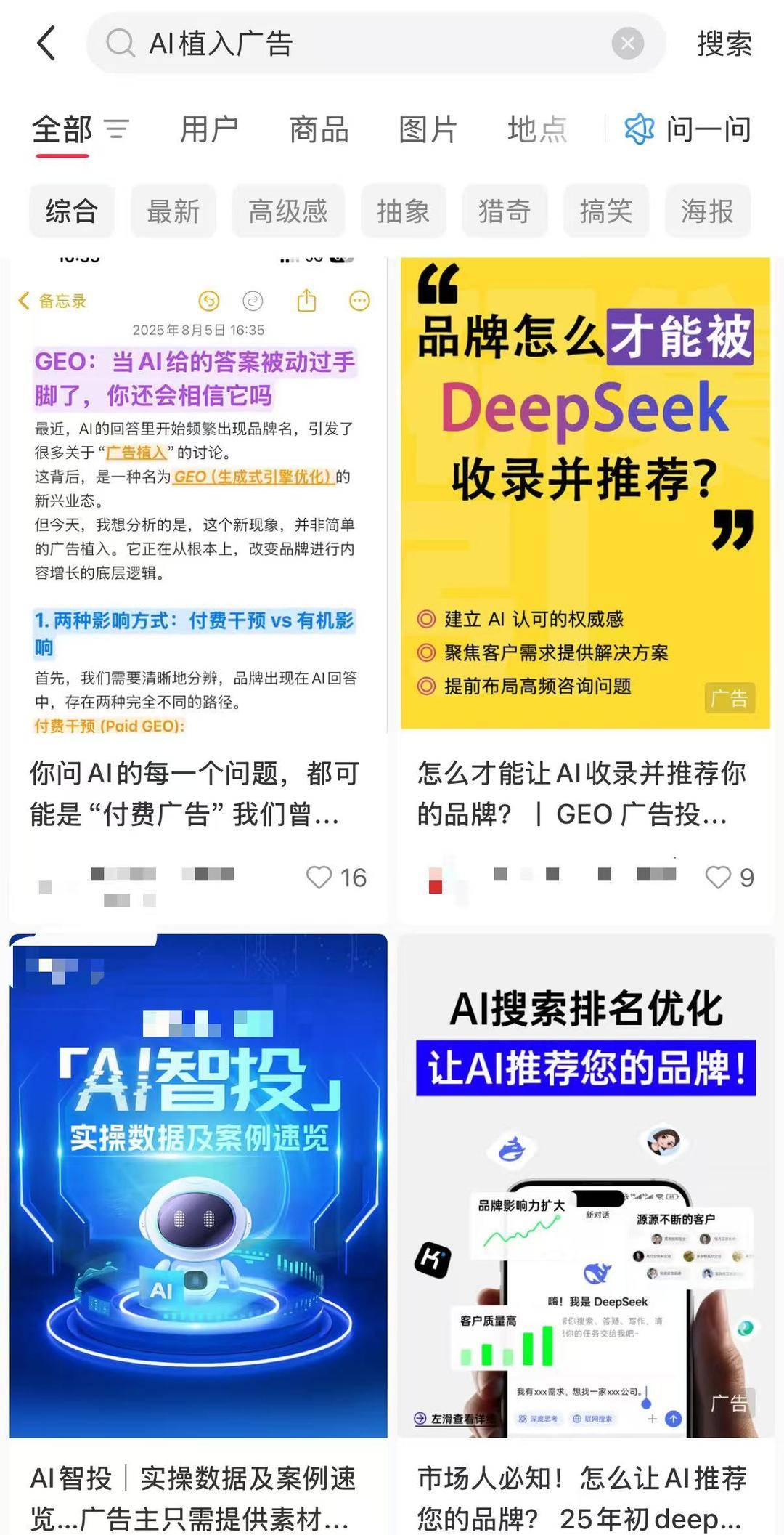 在社交平台检索“AI植入广告”关键词,不难发现近几年陆续有网友分享过类似遭遇——搜索目标信息时,结果中夹杂着明显的商业推广内容。与此同时,“品牌如何被AI软件优先收录”“AI推广怎么做”等求助与咨询帖也屡见不鲜,部分帖子明确标注“广告”标识,点击进入后还会弹出定制化服务咨询入口。