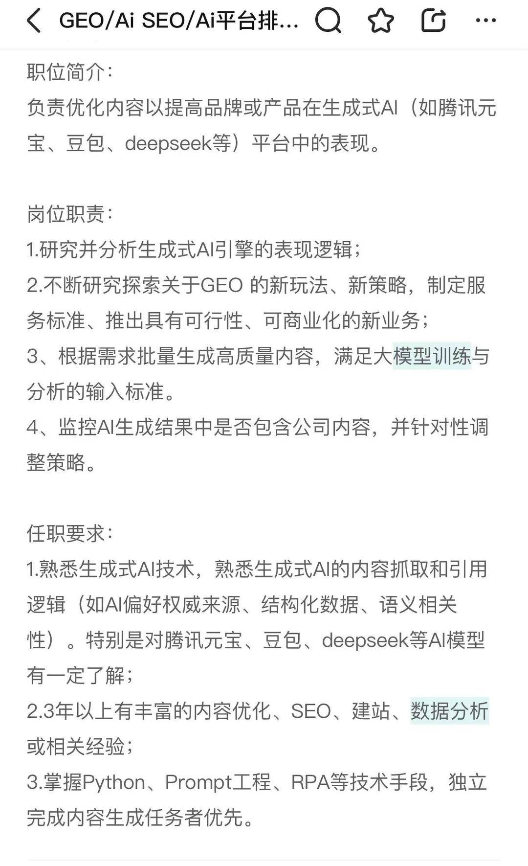 与此同时,记者发现,GEO方向已经成为一种职业,在某招聘软件上看到,招聘市场上也出现了GEO、AI平台排名优化等岗位,职位简介为负责优化内容以提高品牌或产品在生成式AI平台中的表现。主要负责研究并分析生成式AI引擎的表现逻辑;不断研究探索关于GEO的新玩法、新策略,制定服务标准、推出具有可行性、可商业化的新业务;根据需求批量生成高质量内容,满足大模型训练与分析的输入标准;监控AI生成结果中是否包含公司内容,并针对性调整策略等方面。