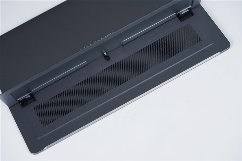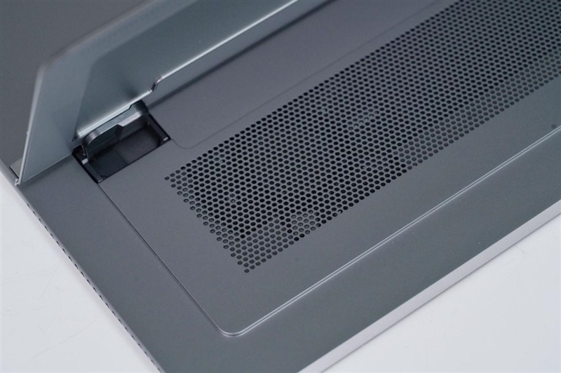支架下方隐藏着4000个散热孔,风孔直径1.2mm,采用高速钻工艺,通孔率接近50%,在14寸的机身上实现了超大进风面积。