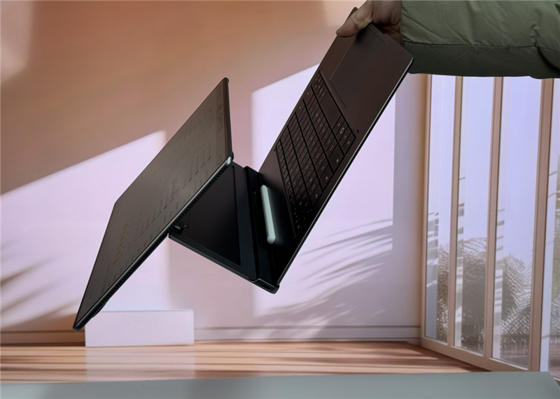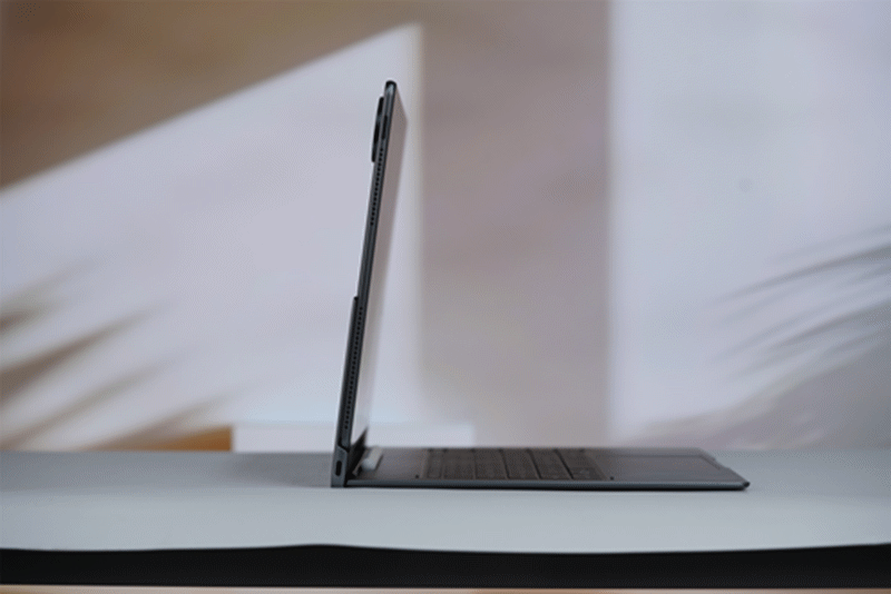 虽然同样都是一台平板电脑再加上一块磁吸键盘,但是传统的二合一平板电脑需要在打开平板的支架支撑在桌面上,会占用大量桌面空间。如果放在腿上,或者是一些比较窄的地方,就难以维持笔记本形态。