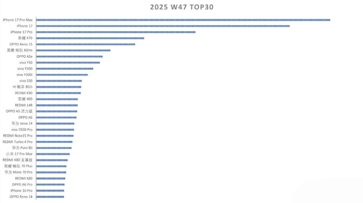 最新发布的2025年11月第三周(11月17日-23日)国内手机销量数据显示,iPhone 17系列三款新机以绝对优势垄断销量榜前三席,成为最大赢家。而国内声量颇高的小米、华为两大品牌,却无一机型进入前十。
