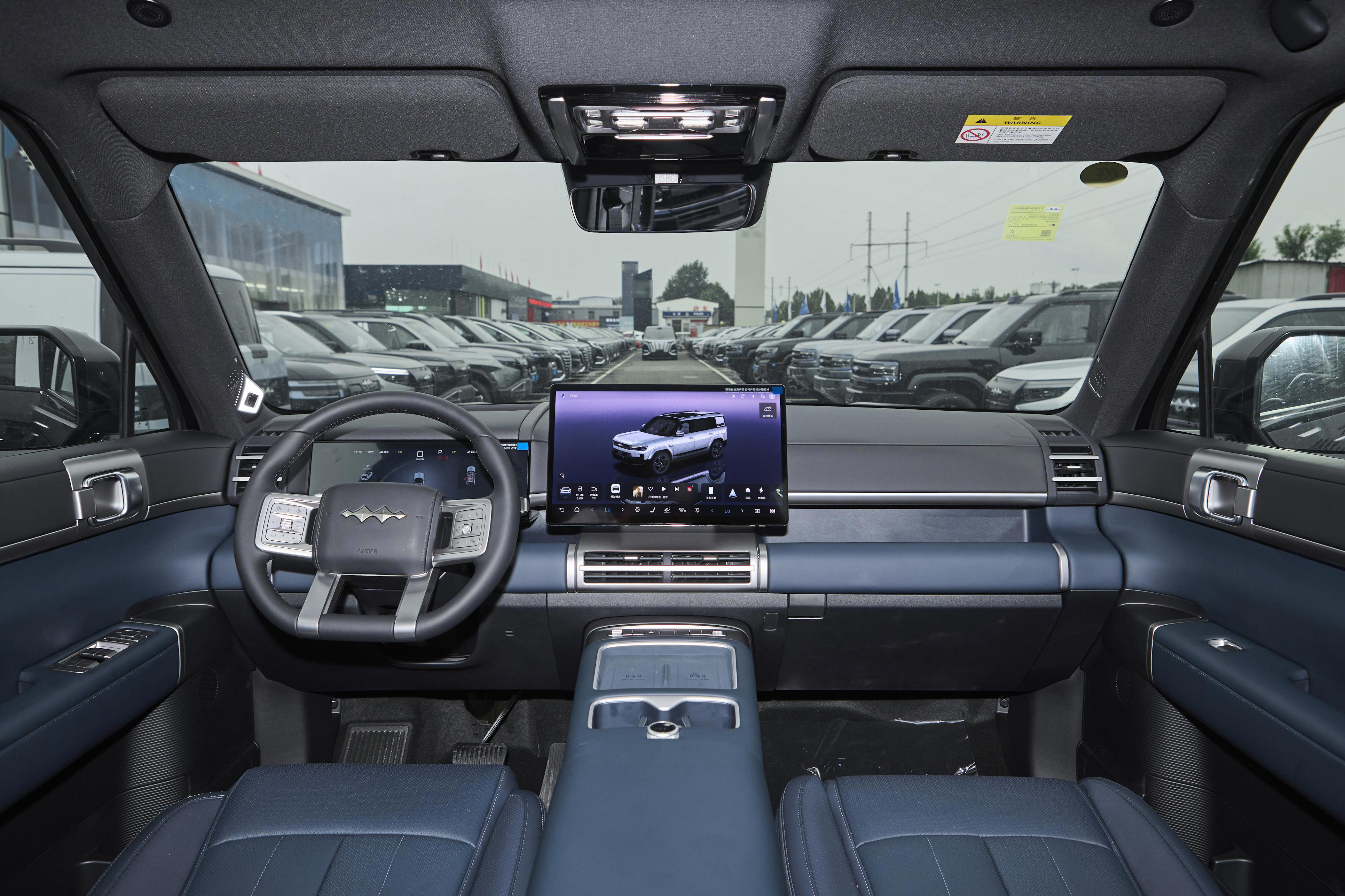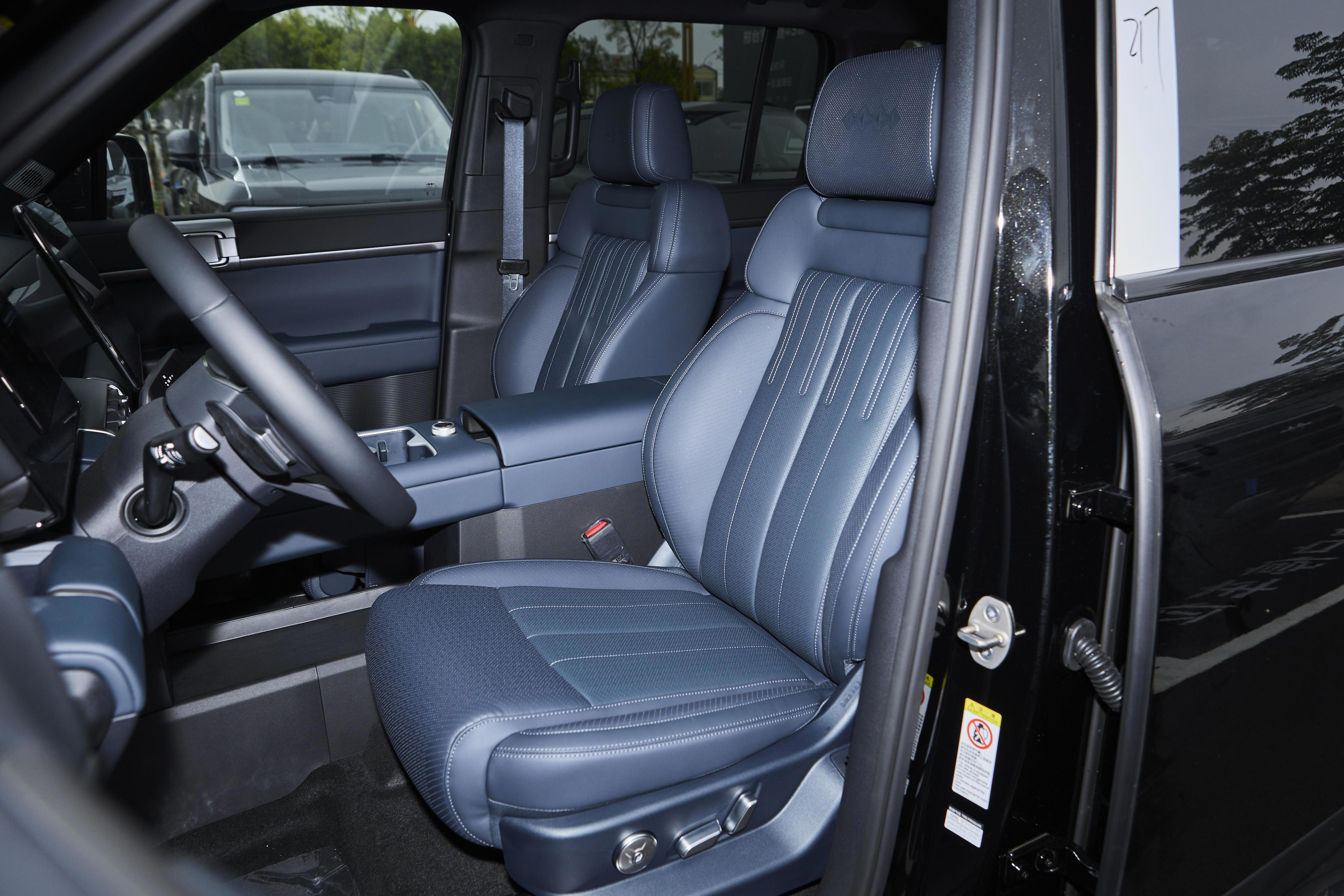 外观设计上,这款车呈现出独特的风格,将硬朗与前卫元素融合在一起。车身尺寸为4999×1995×1865mm,方正的外形搭配“星际方舟”设计语言,车头的隆起线条与“H型”面板共同塑造出稳重的前脸造型,让人一眼就能记住。钛能大灯和尾灯采用双L形灯带设计,点亮后有着清晰的辨识度,科技感也随之显现。方舟舷窗的设计很实用,不仅让车身侧面看起来更具层次感,还增加了侧窗的可视面积,让车内的采光效果得到了提升。外观提供7种配色选择,青峦翠、晨光蓝、极光白等颜色能满足不同家庭的审美偏好,其中极光白配色干净清爽,作为家庭用车日常出行,既百搭又显得大方得体。车身侧面配备的255/60 R19轮胎,与车身比例协调,整体造型传递出沉稳且富有力量的视觉感受。