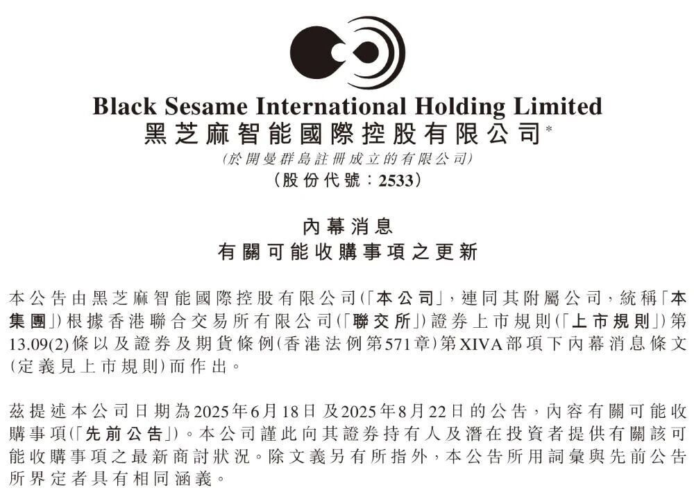 黑芝麻智能表示,在可能的收购事项完成后,预期将取得目标公司的多数股权,目标公司将被视为本公司的非全资附属公司,其财务业绩将并入上市公司。预期可能收购事项将于2026年第一季度完成。