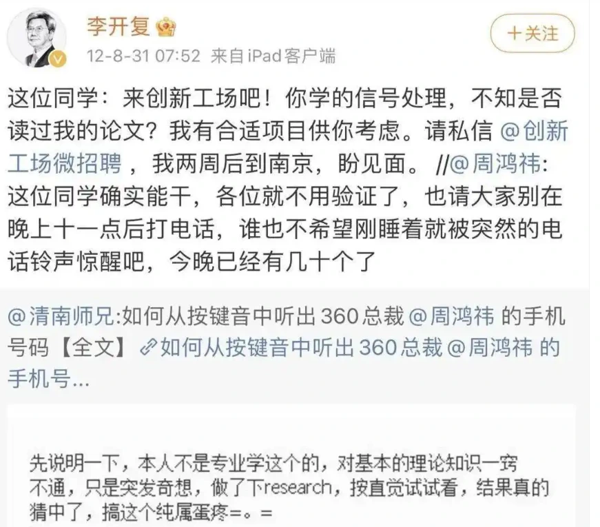 他更是能仅凭一段不到2秒的录音,就破解了360创始人周鸿祎的手机号。
