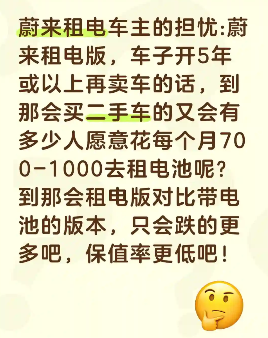 从实际残值来看,租电版的折旧确实更明显。以某热门蔚来车型为例,新车买断版 35 万左右,租电版起售价低 5-8 万,但开 5 年后,买断版二手车残值约 18-20 万,租电版仅 12-15 万,不仅绝对残值低,保值率也比买断版低 10%-15%。更关键的是,租电版的二手车流通速度慢,很多车商收车时会刻意压价,甚至直言 “租电版不好卖,除非降价急售”—— 毕竟车商要考虑后续转手难度,自然会把风险成本算在卖家身上。